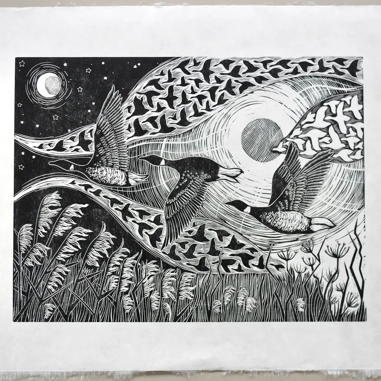 In some of her pieces, colour plays a role, in others, stark contrasts shape mood and form. Her monochrome prints, in particular, have a slightly darker tone that touches on themes of life and death, often echoing the natural rhythms she observes in the world around her. What makes Caroline’s practice distinct is how seamlessly she moves between subjects and media while maintaining a clear voice. Her printmaking does not feel distant or decorative. Instead, it feels alive, curious, and rooted in her own way of seeing and responding to nature. Her work shows how traditional processes can be both expressive and precise, capable of capturing the beauty of overlooked creatures and the subtle complexities of the world they inhabit. Through her linocut and related printmaking, Caroline Erolin reminds us that the natural world is full of quiet stories waiting to be noticed, and that handmade art has a way of making those stories visible in ways that feel both personal and visually striking.
