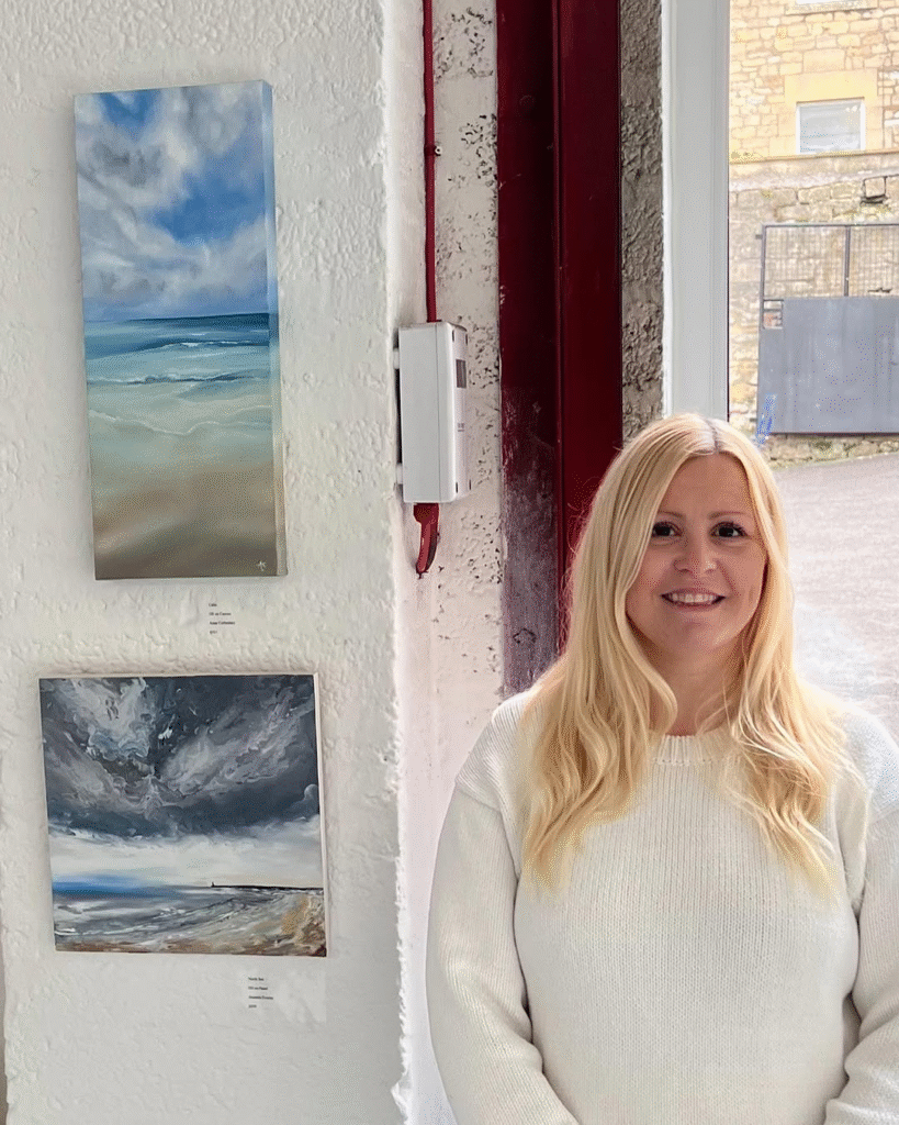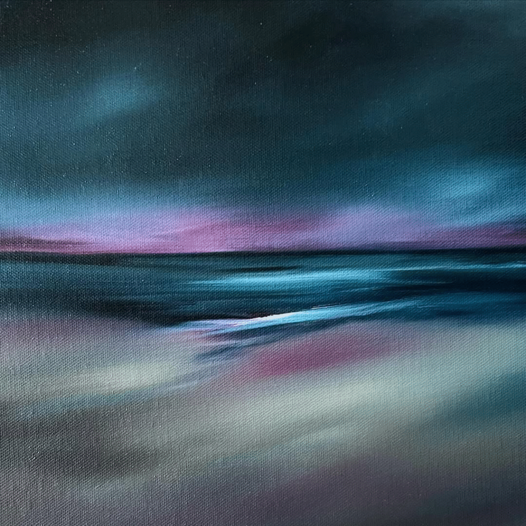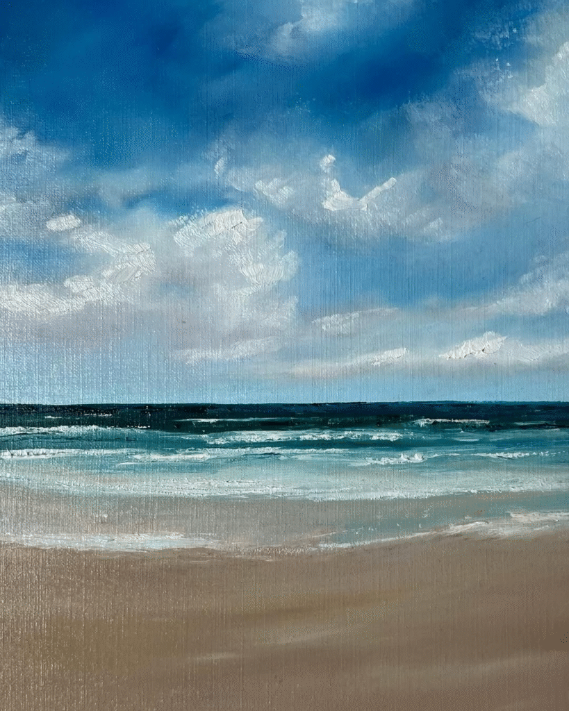 What makes Anna’s art so moving is the way it connects. You don’t just see the coast in her work, you feel it. The salt air, the changing sky, the hush of waves it’s all there, reminding you of moments you may have lived by yourself. Looking at her work, you don’t just see the coastline you feel the atmosphere wrapping around you. Her paintings have that rare ability to slow your rhythm, to quiet the noise of everyday life, and to let you settle into a gentler pace. Her seascapes aren’t glossy postcards of perfect beaches. They are love letters to the sea’s moods, to its unpredictability, to the way light and water can move through us as much as around us. They remind us that nature doesn’t have to be extraordinary to be profound. A stretch of coastline you’ve walked a hundred times can, in Anna’s hands, become something quietly magical, a mirror of your own memories, emotions, and need for stillness. Through her exhibitions and community connections, Anna shares this vision with others, inviting them to experience the coast in its truest form: not as a backdrop, but as a living presence. Her paintings remind us that the sea has endless ways of speaking to us sometimes in whispers, sometimes in waves and that listening to it is a way of listening back to ourselves.