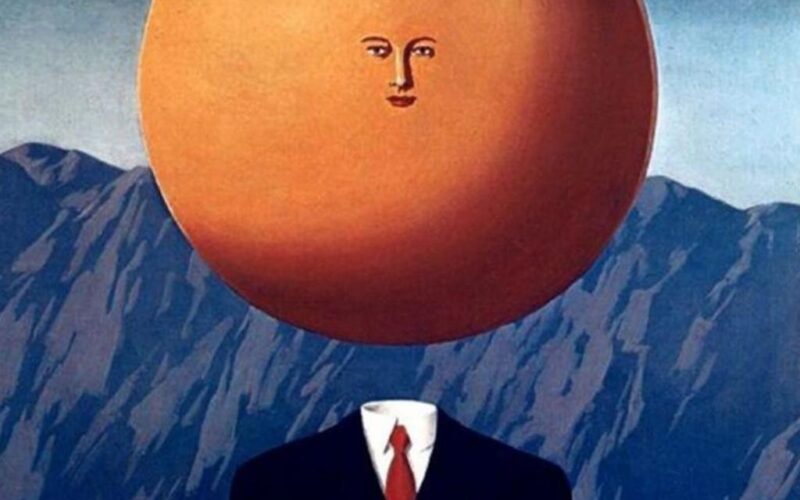 At first glance, the painting appears relatively straightforward. A man stands in a quiet, open setting, his body rendered in a realistic manner. But the normalcy ends at the head. Instead of a face, we see a large, smooth, orange sphere. It replaces identity entirely, turning the figure into something anonymous and difficult to interpret.