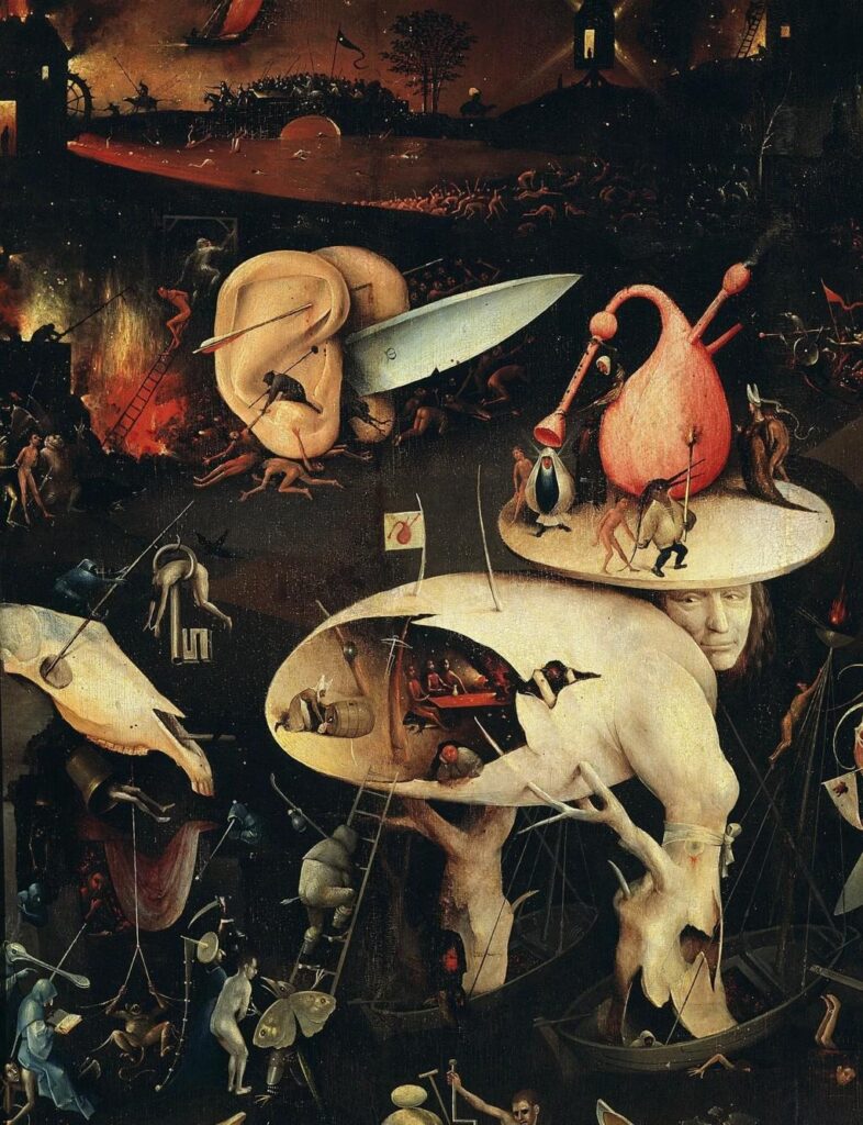The painting is structured as a triptych, traditionally read from left to right. It begins with a relatively calm depiction of paradise, shifts into a chaotic and sensual middle panel, and ends in a dark, nightmarish vision of hell. While this structure suggests a clear narrative, the details within each panel resist easy interpretation. Everywhere you look, there is something unexpected: oversized fruits, hybrid creatures, distorted bodies, and scenes that feel both playful and disturbing.