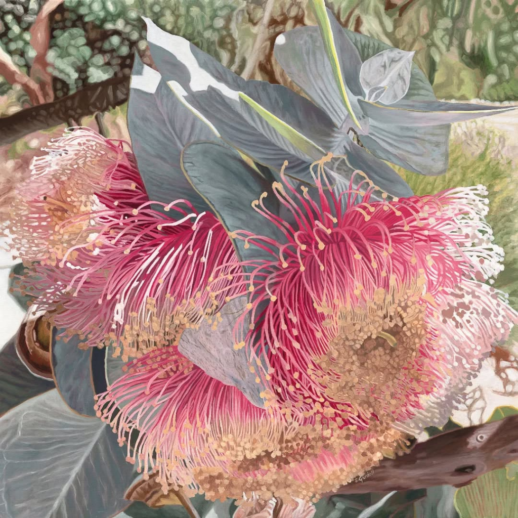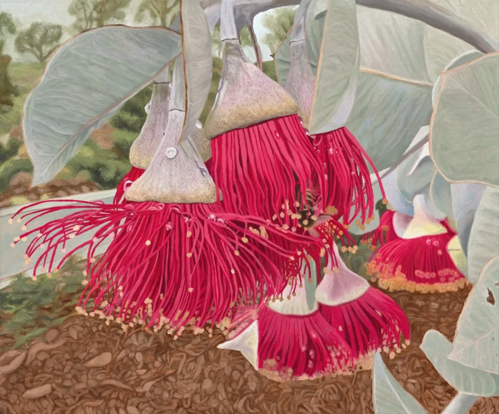 Stacy Gardoll’s paintings feel like quiet invitations to slow down and really look at the natural world. Working from her home in the Perth foothills, she focuses on botanical subjects and broader natural themes, but she doesn’t approach them as mere studies of form. Instead, her work carries a sense of calm that suggests reflection and a kind of stillness you don’t arrive at quickly but discover over time. There’s a thoughtful rhythm to how her pieces unfold. Flowers, leaves, and plant forms aren’t just rendered for accuracy; they’re painted in a way that captures how light settles on them, how colour shifts across surfaces, and how shapes feel in space rather than simply what they look like. This approach gives her work a layered quality, where colour and shape seem to respond to one another rather than simply sit beside each other. Stacy’s background in design for theatre and film where depth has to be suggested on flat surfaces shows up in how she builds her compositions. The way she balances light and shadow, and places forms against open space, suggests a painter not just observing nature but thinking in terms of atmosphere and mood as well as form.