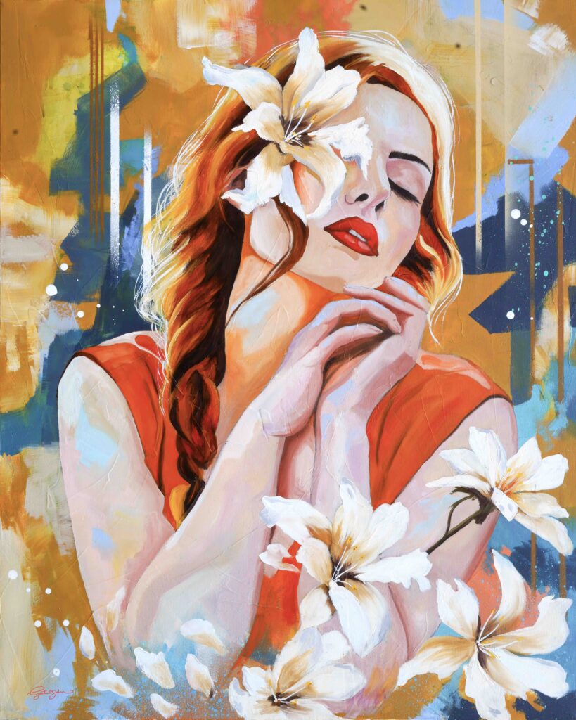 Q2 . Your work is described as bold, expressive mixed-media pieces, and you speak of capturing “the strength of a woman, the joy tucked inside stillness, the fire that lives beneath softness.” What motivated this focus of your creative voice?