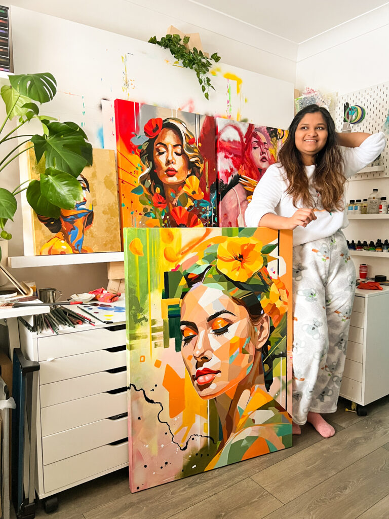This part of my process is actually very intentional, even if the final result feels intuitive. Every painting begins digitally on my iPad. I design the portrait, the background, and the overall mood first in procreate or Pixelmator Pro in my laptop, so I already know who this woman is, what she carries, and what the painting is trying to say emotionally. That initial design gives me clarity and direction before I ever touch the canvas. Once I move to the physical artwork, I always begin with the background. This is where things loosen up. Even though I have a reference, I let go of control at this stage and allow abstraction, texture, and instinct to take over. I layer paint, add marks, respond to what’s happening on the surface, and let the energy of the moment guide me. That phase is very much about creative flow, about listening rather than deciding. The background almost sets the emotional temperature of the piece. Only after that do I start with the portrait. The figure usually is close to the reference that I designed, but it subtly adapts to the background that I have made. The colours might shift, or edges soften, lines respond to the movement that is already present in the background. The portrait isn’t imposed on the abstraction, it’s placed into a space that already has its own life and history. There are elements I return to again and again without forcing them. Spray paint marks, jagged lines made with solid markers, and flying petals appear naturally in my work. I don’t overthink them. The flying petals, especially, is something that I keep returning to in every painting. For me, the boundary between figuration and abstraction isn’t about deciding how much to reveal or hide. It’s about allowing structure and intuition to coexist. The planning gives the work meaning and grounding, and the abstraction gives it soul. The conversation between those two is where the painting truly comes alive.